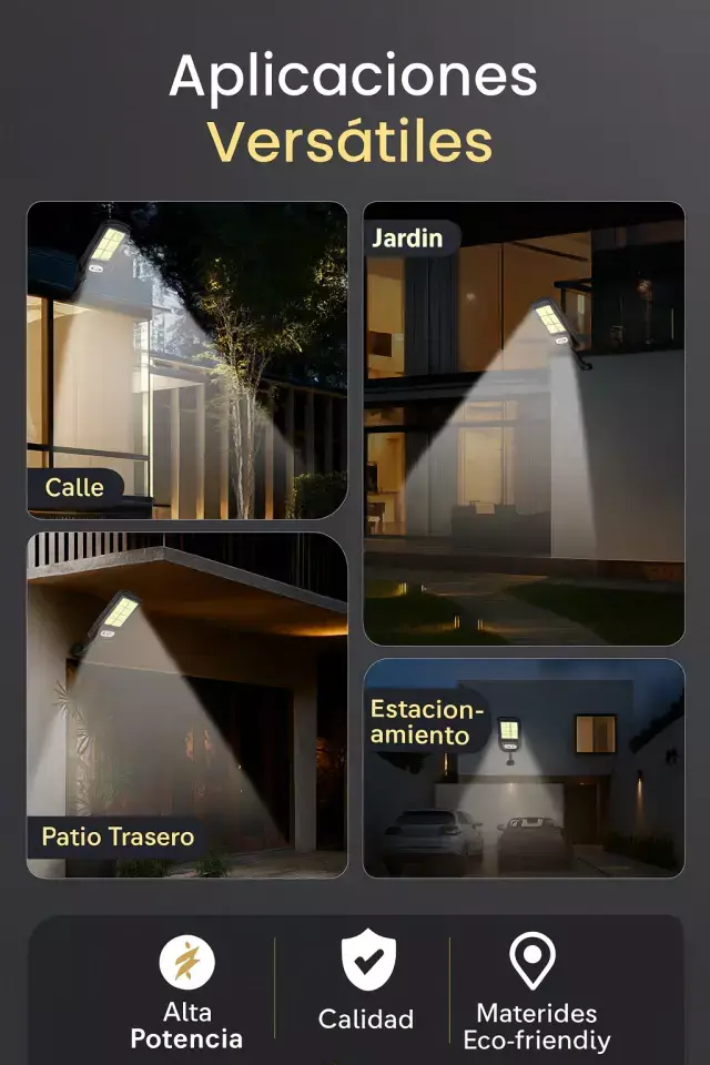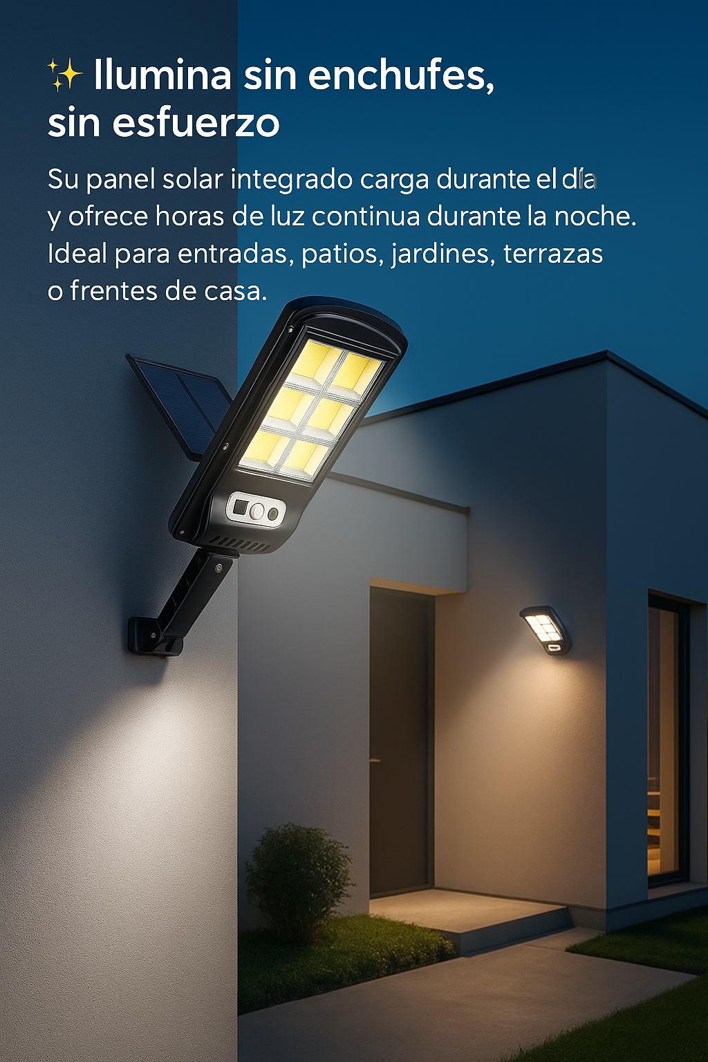 Su panel solar integrado carga durante el día y brinda horas de iluminación continua por la noche. Ideal para patios, frentes y terrazas.